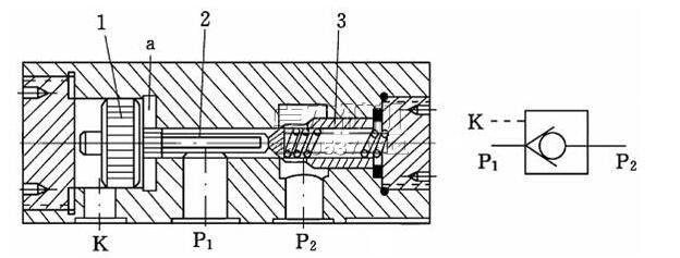 主要用来闭锁液压支架立柱千斤顶工作腔中的液体,而使之保持压力。当液压支架立柱千斤顶另一腔进液时,同时给该阀的控制腔供液,将阀打开,使液压支架立柱千斤顶工作腔中的液体回液。